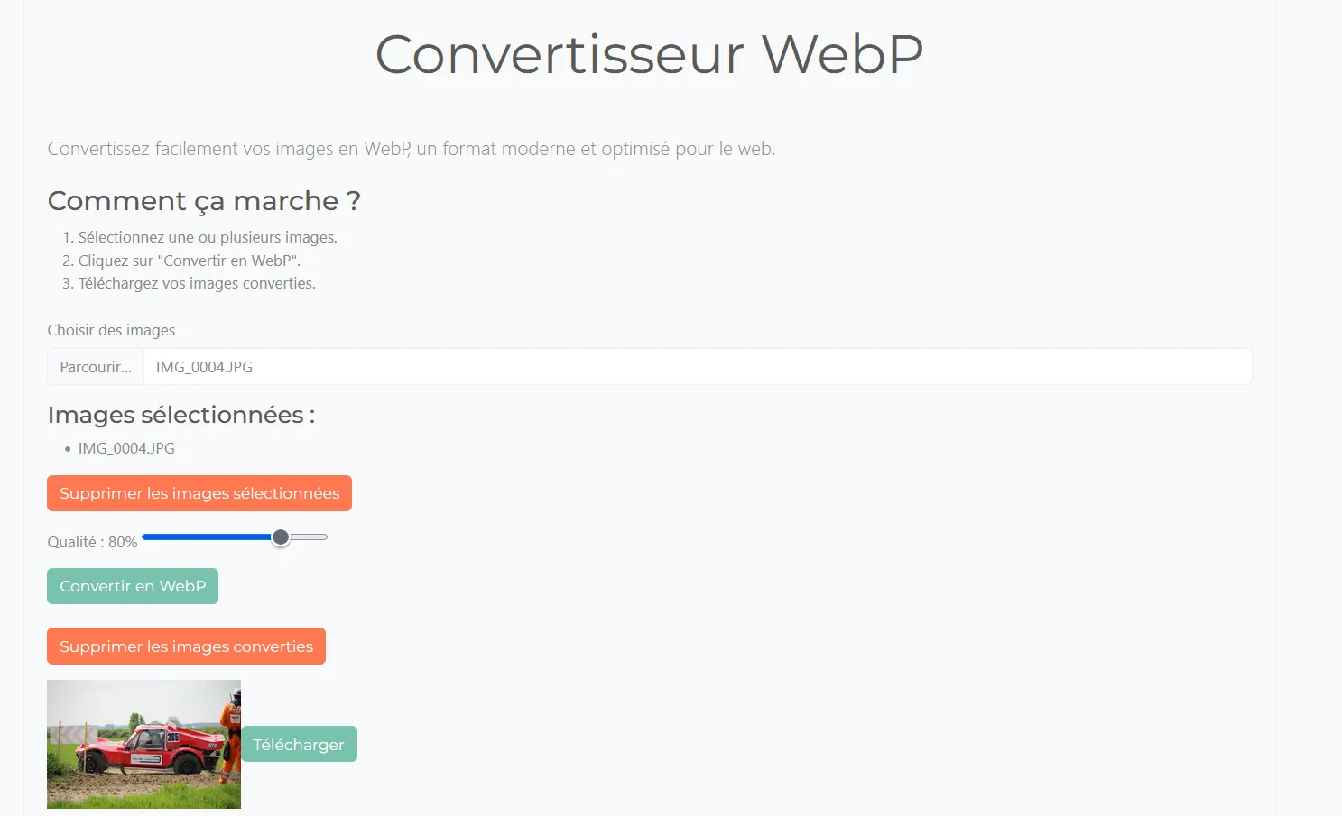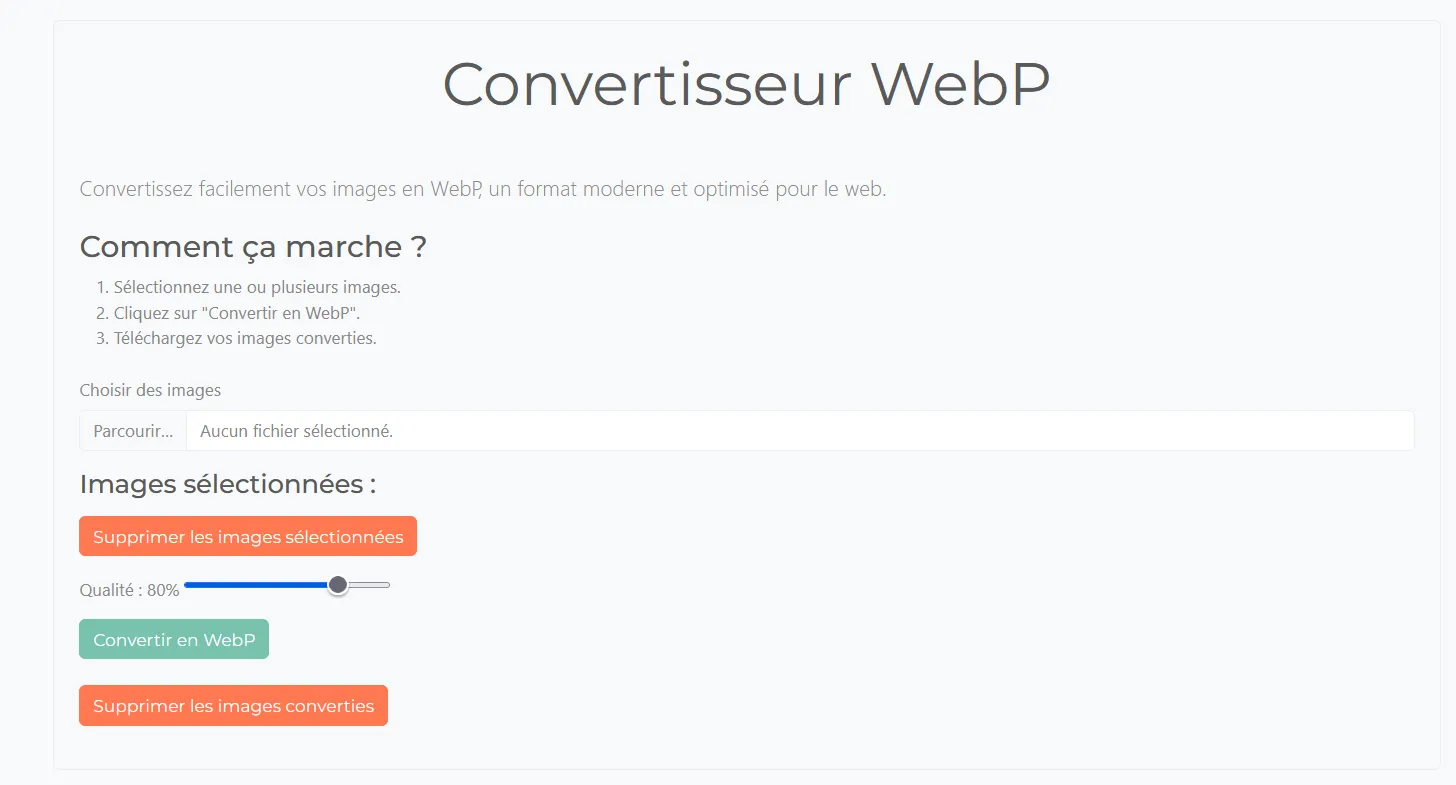 Vous pouvez importer une ou plusieurs images, régler la qualité de compression selon vos besoins, et obtenir rapidement vos fichiers convertis.